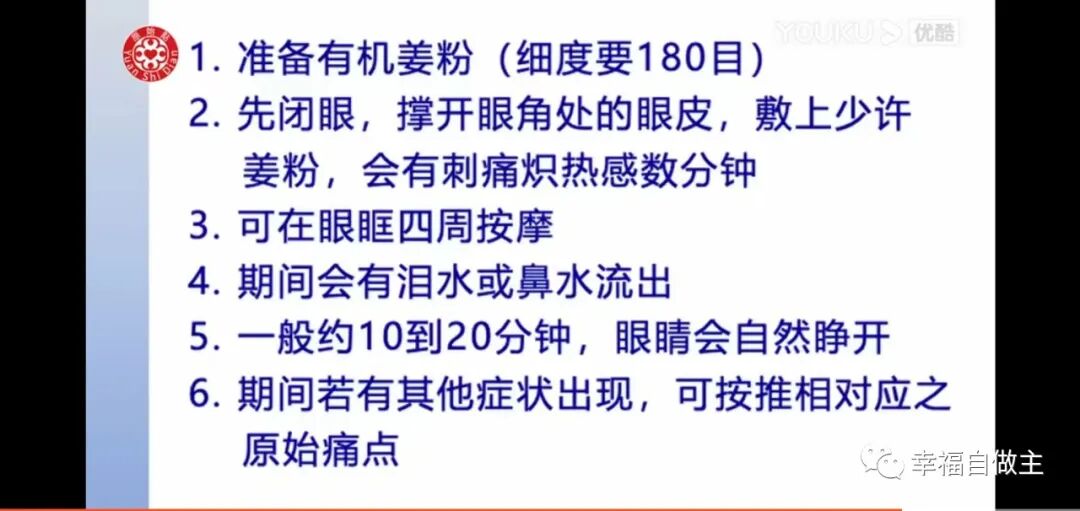 華山志工徐老師:張醫師這一期的視頻講座干貨滿滿,但是在使用中一定要以人為本,比如姜粉敷眼睛給孩子用的時候要慎重,用量也要因人而異,我昨天試了試,把姜粉放眼角的時候非常疼,做完我的眼睛充血,身強體壯的可以試試上面的方法治療花眼,飛蚊癥,近視眼等。(注:徐老師第二天再姜粉敷眼,就沒再出現充血現象)