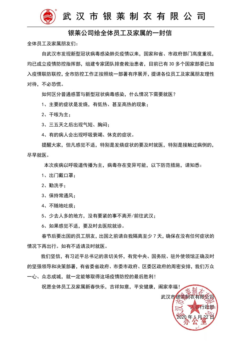 1月22日,銀萊公司行政部在各部門各車間微信群發第一封信給銀萊家人!