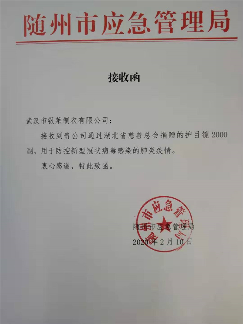 銀萊公司總經理張金敏通過行業協會、同行廠家、防護用品生產廠家等各種渠道,多處聯系,從外地緊急購進防護眼鏡2000個、價值10萬元捐贈給湖北省慈善總會。