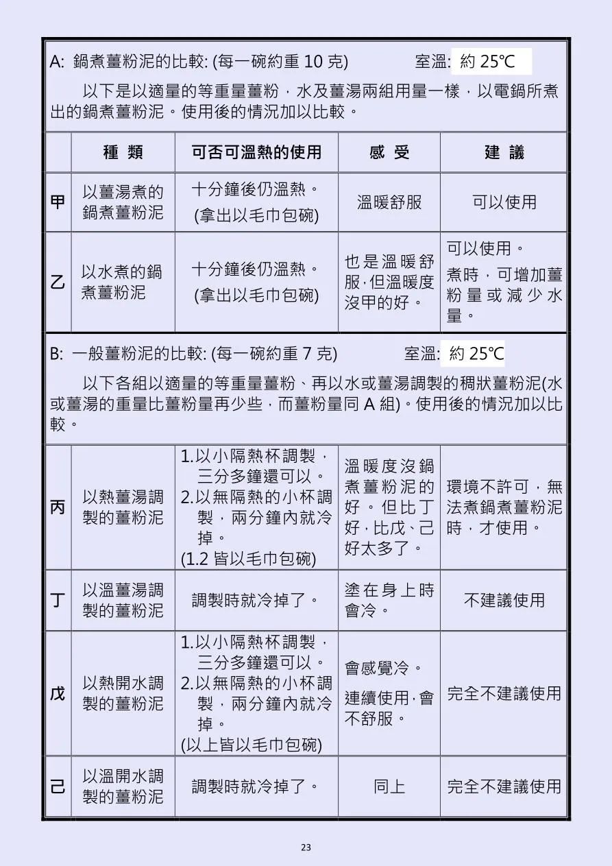 以下是以適量的等重量姜粉,水及姜湯兩組用量一樣,以電鍋所煮出的鍋煮姜粉泥。使用后的情況加以比較。